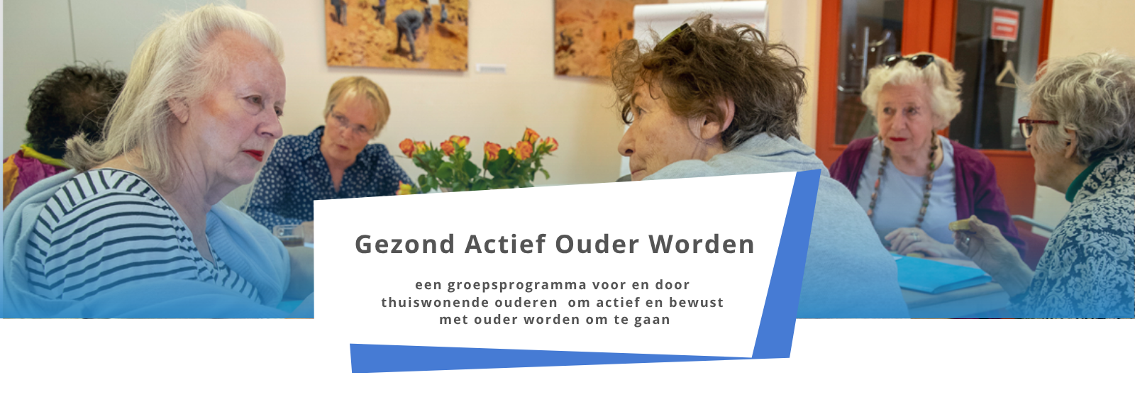 Gezond Actief Ouder Worden is een wijkgericht groepsprogramma voor en door thuiswonende ouderen. Deelnemers wisselen ervaringen en kennis uit, en verkennen actief onderwerpen die zij belangrijk vinden. Nu en met het oog op de toekomst. Gezond Actief Ouder Worden groepen worden ondersteund door een duo van een oudere en een sociaal-agogische beroepskracht die samen zijn geschoold in het programma.